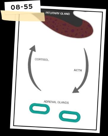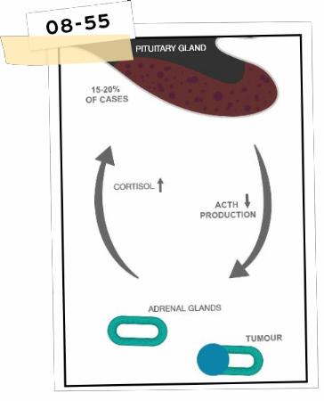 Som nämnts ovan sitter hypofysen i skallbasen, nedanför hjärnan, och den ansvarar för produktionen av ACTH som i sin tur får binjurarna att producera kortisol.